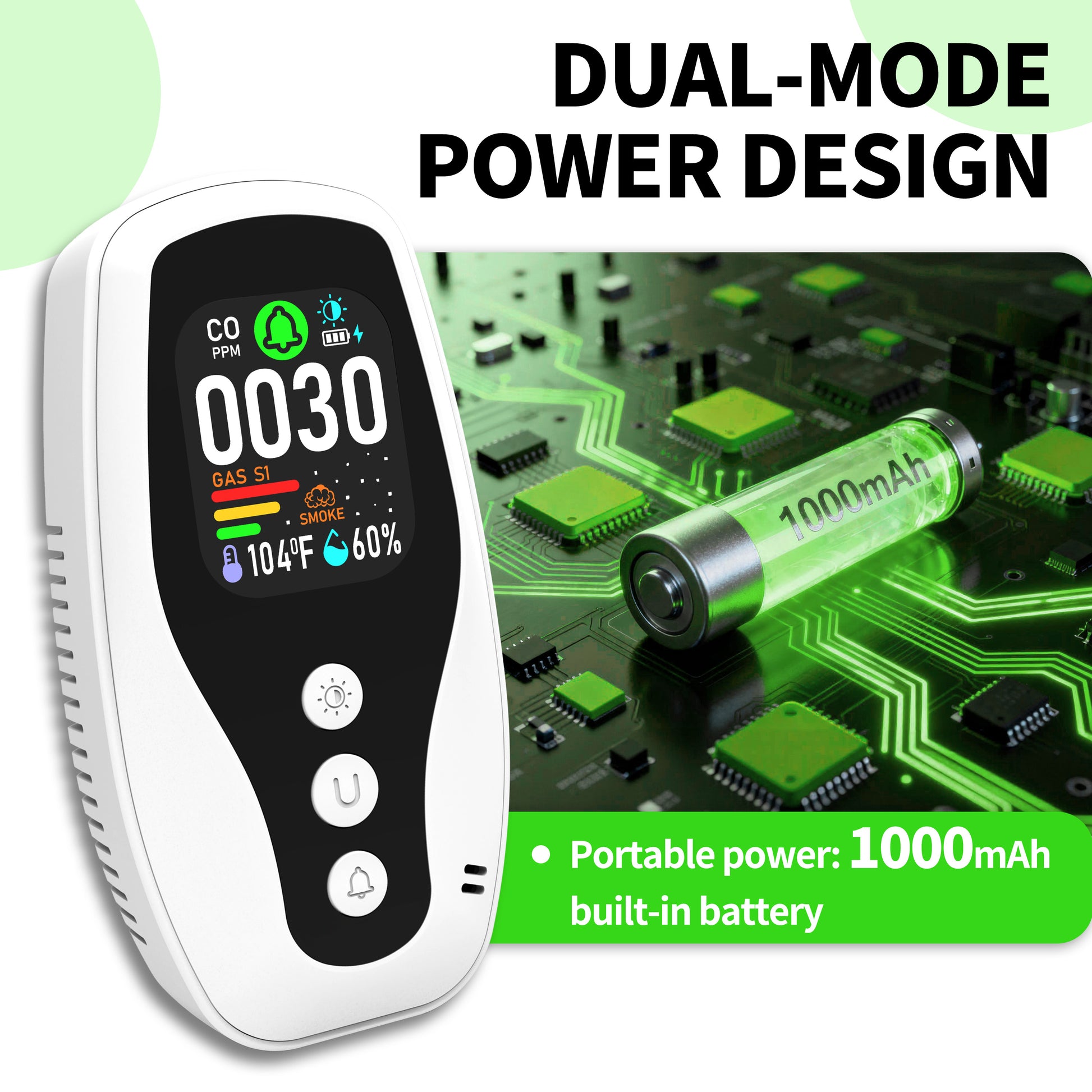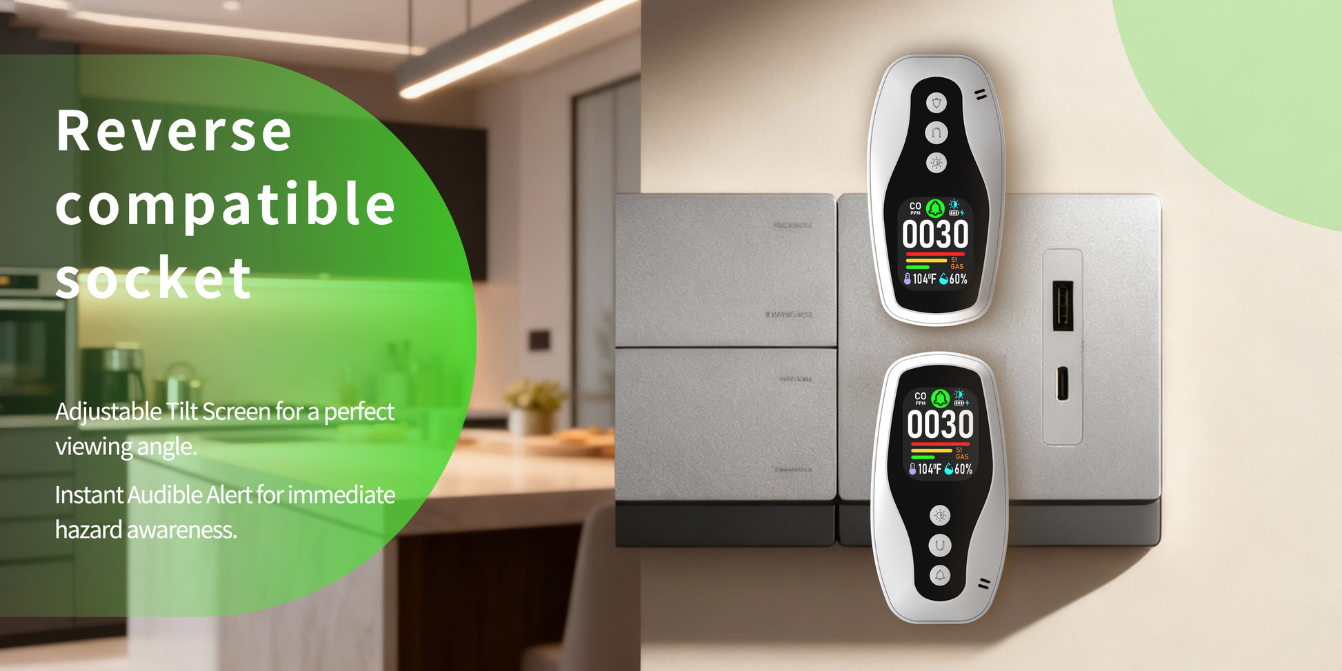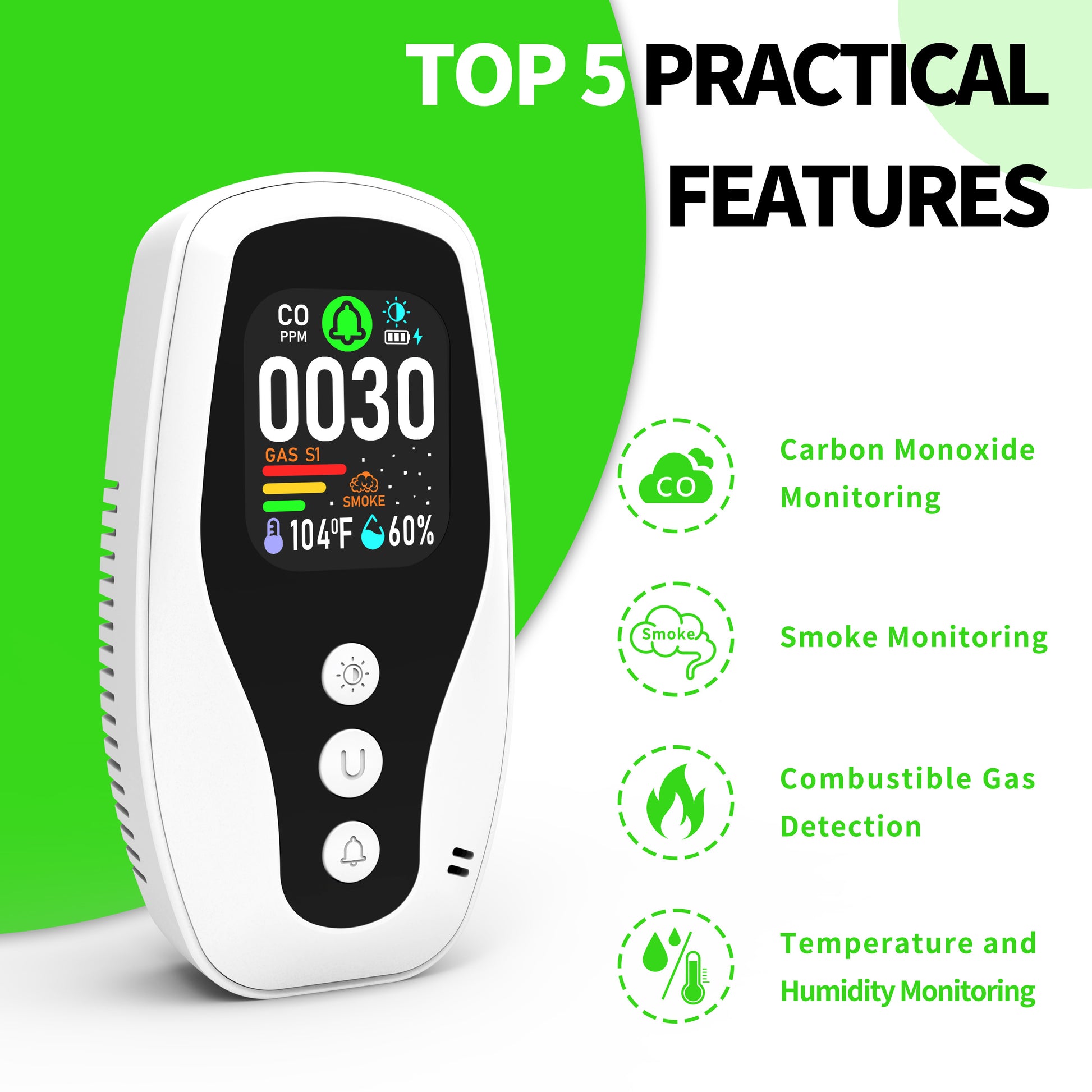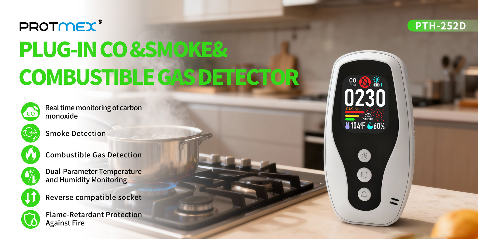 Real Time Monitoring of Carbon Monoxide, Combustible Gas Detection, Smoke Detection, Reverse Compatible Socket, Dual Parameter temperature and Humidity Monitoring, Flame Retardant Protection against Fire.