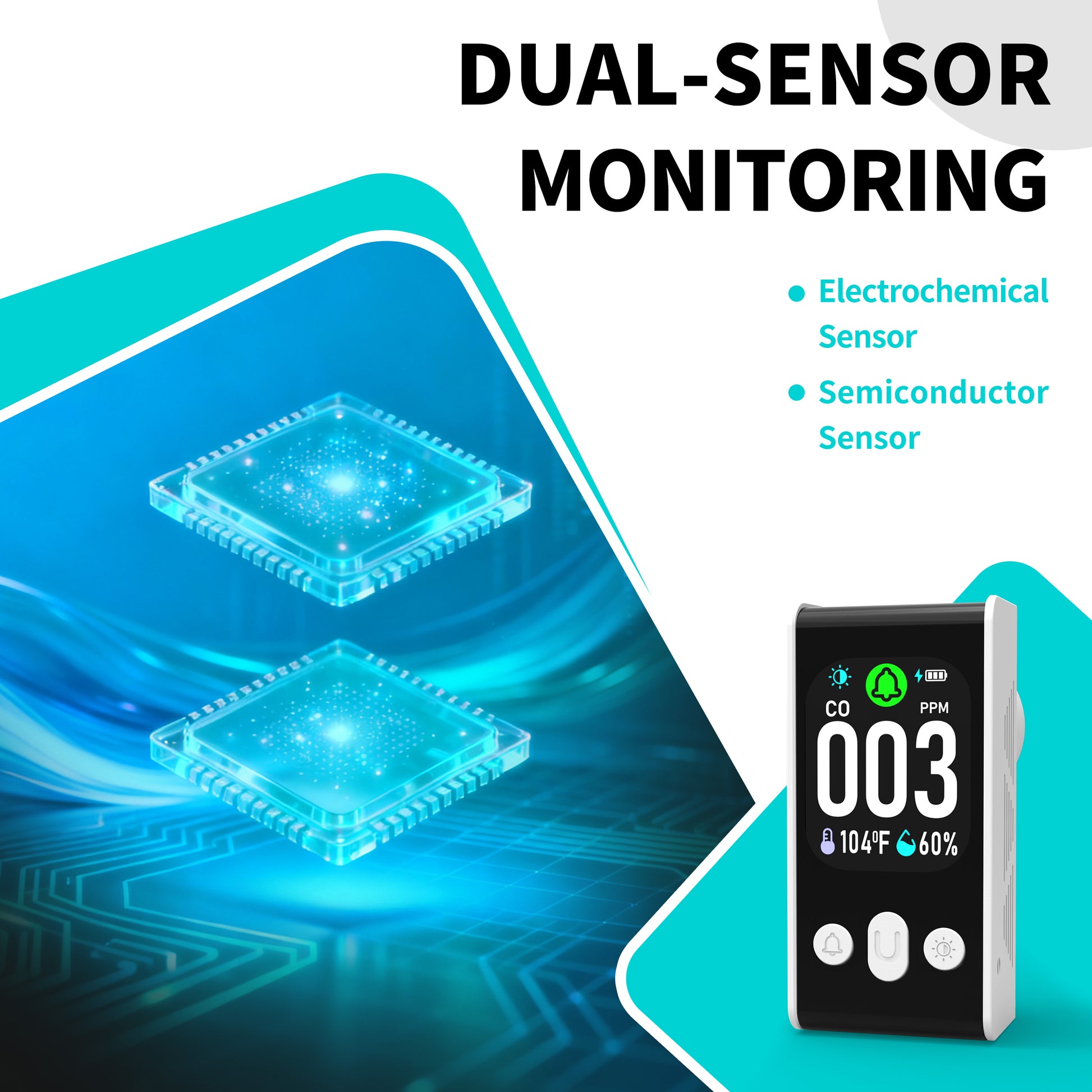 Clear Display for Instant Status Updates: The easy-to-read screen shows real-time CO levels (e.g., 003 ppm), temperature (e.g., 104°F), and humidity (e.g., 60%) at a glance. Stay informed with accurate, up-to-date environmental data.
