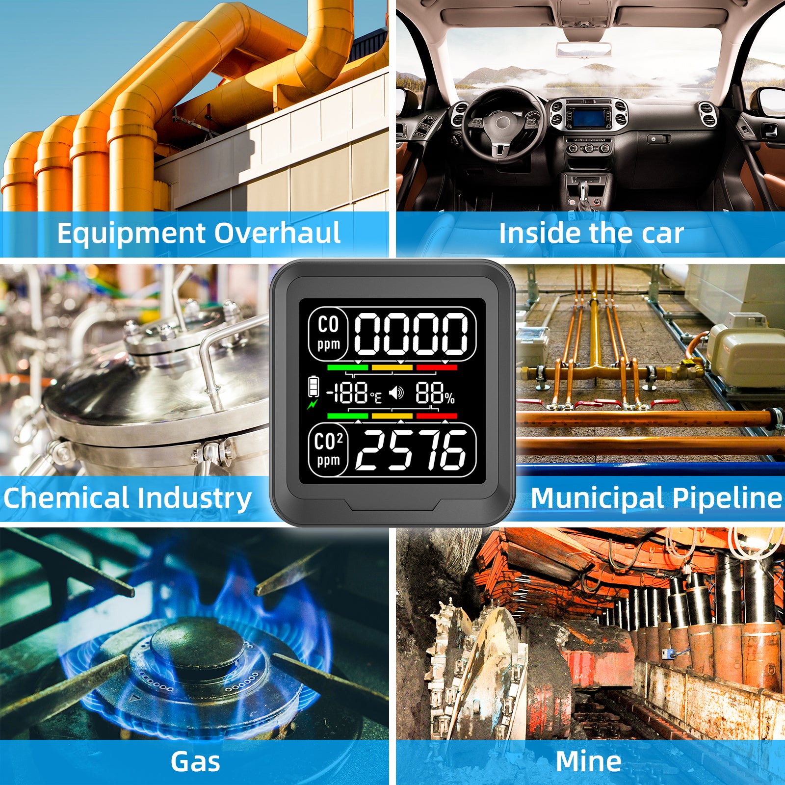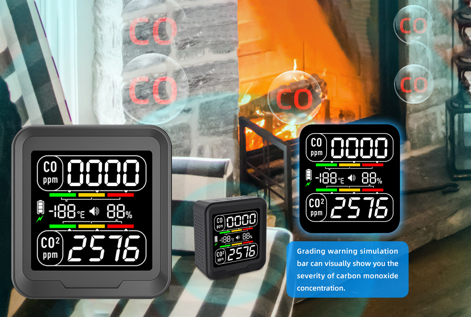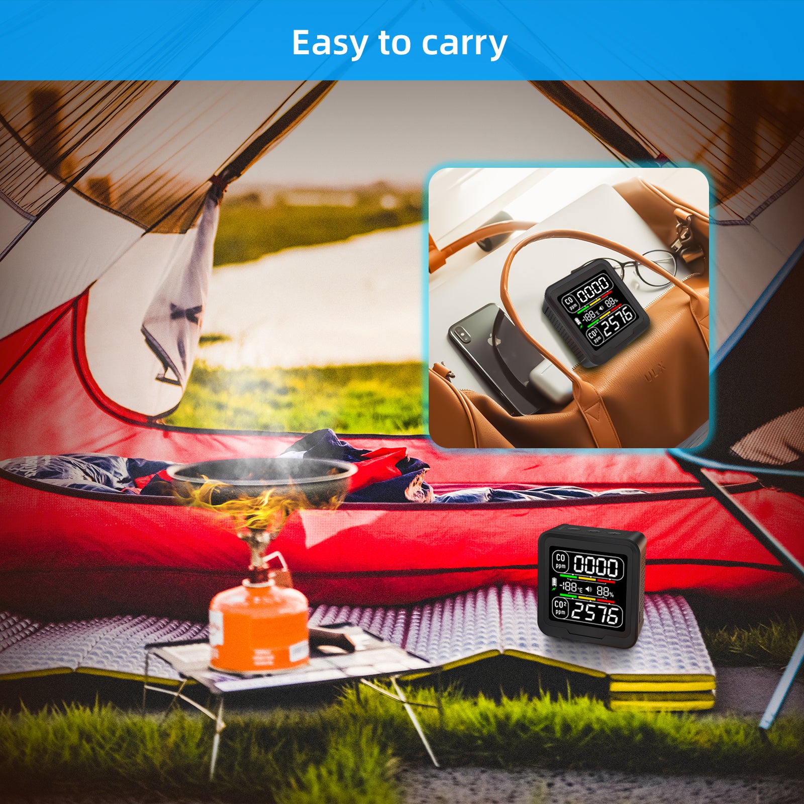 【Exquisite and Portable】The gas detector adopts wall-mounted and vertical designs, and the bottom can be placed freely, so you can easily place the air quality detector in indoor places such as living rooms, bedrooms, kitchens, etc. to measure C.O,C.O2, temperature and humidity. Indoor air quality detector are also safety guards for travel and outdoors, designed for use in RVs, boats, planes, trucks, cars, camping tents, stove heaters and other confined spaces.